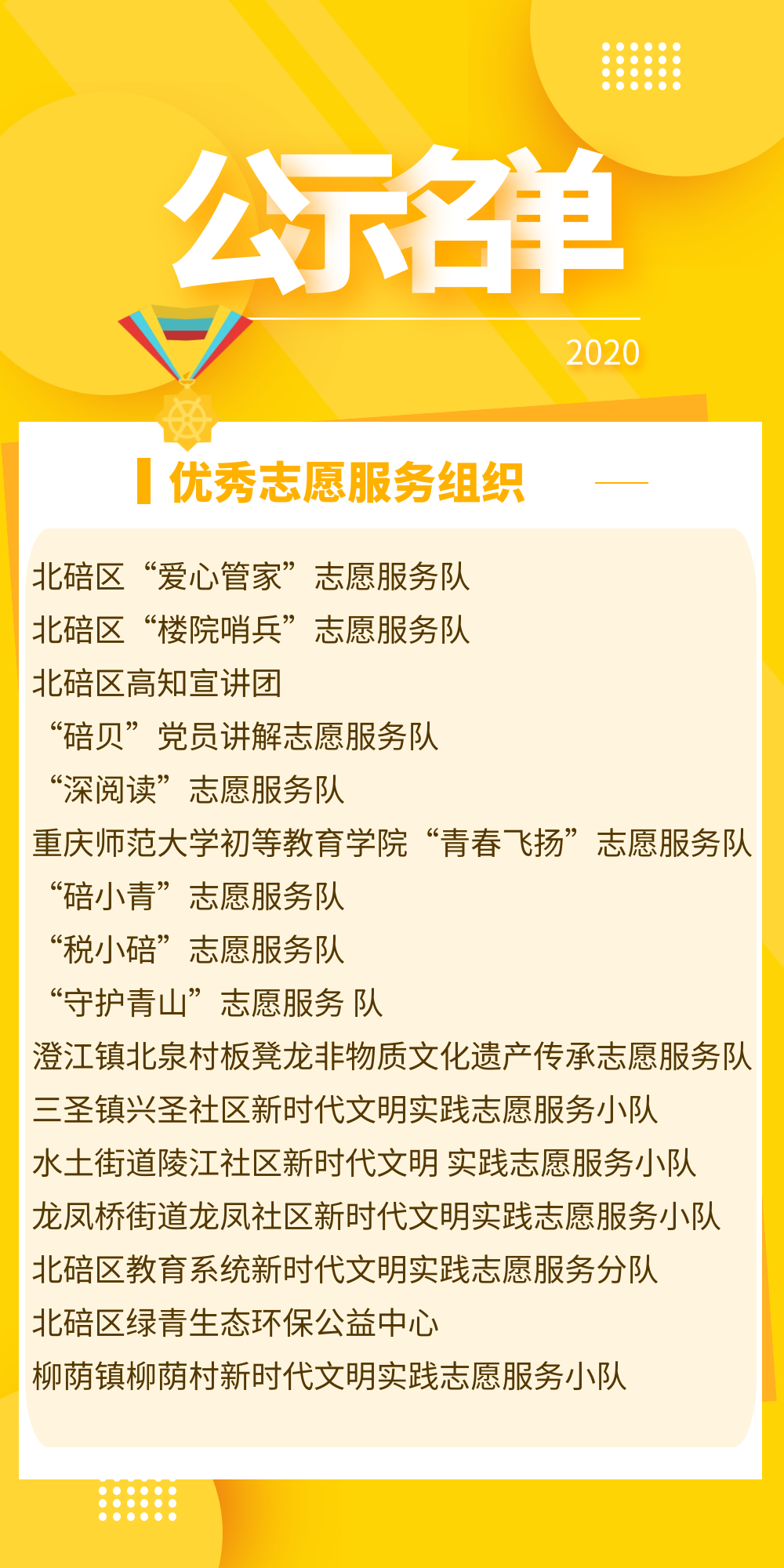 在北碚区新时代文明实践志愿服务先进典型宣传推选活动中,经过公平推荐和严格评选,拟评选优秀志愿者12名、优秀志愿服务项目10个、优秀志愿服务组织16个、优秀志愿服务村(居)10个。