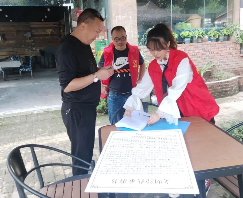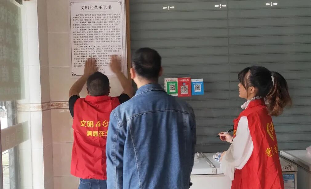 志愿者走进每家商铺都会给商家宣传文明承诺书上的经营行为,引导商家文明经营。